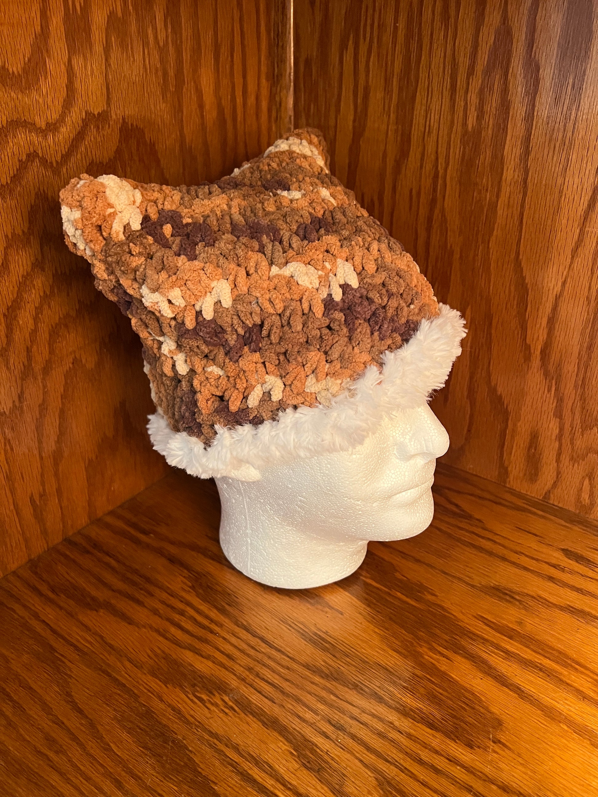 Cat beanie in shades of brown or grey. Cozy and warm. Hat size is 22” circumference.