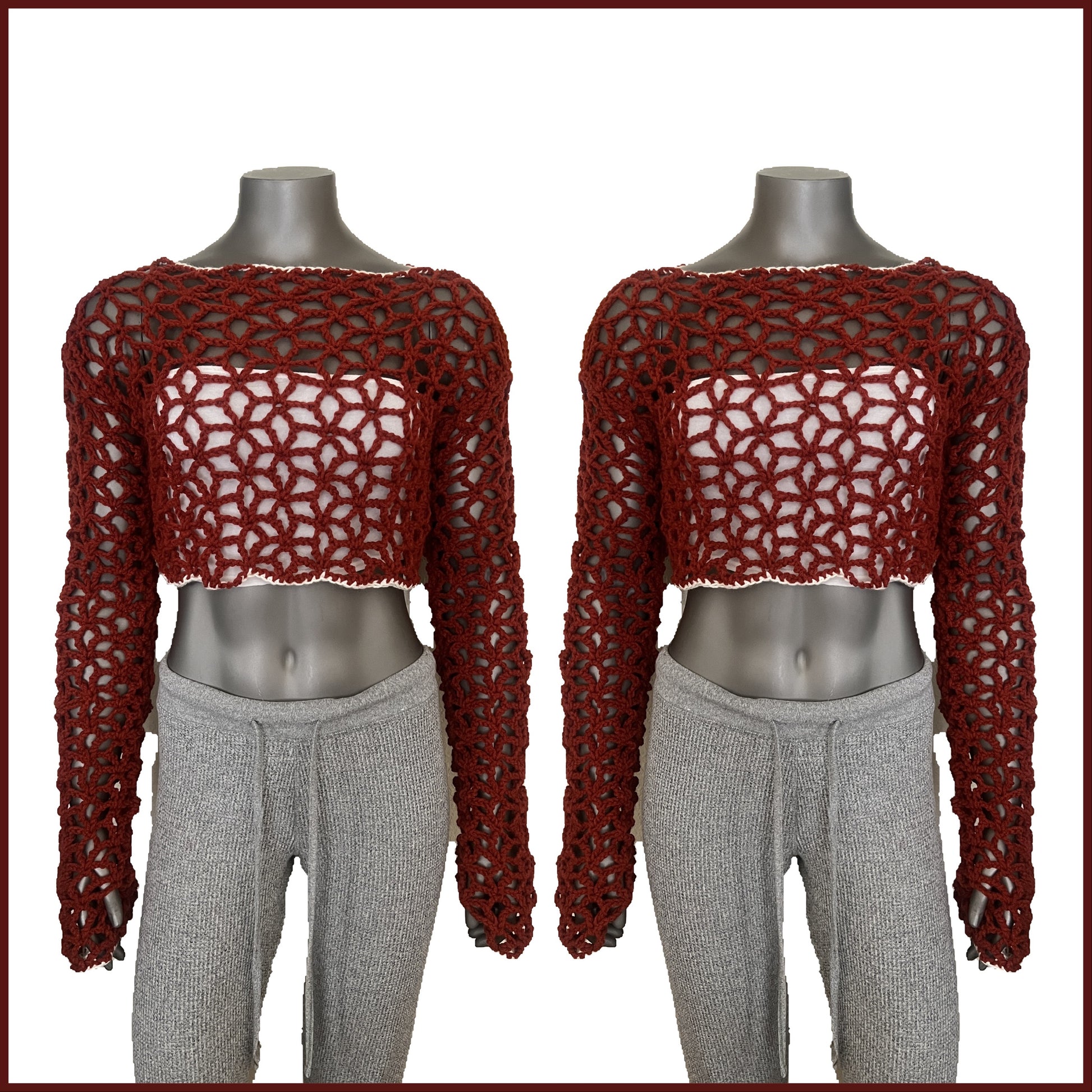 Cropped, flower stitch sweater with extra long sleeves and a white border, main color is a clay/terra cotta.