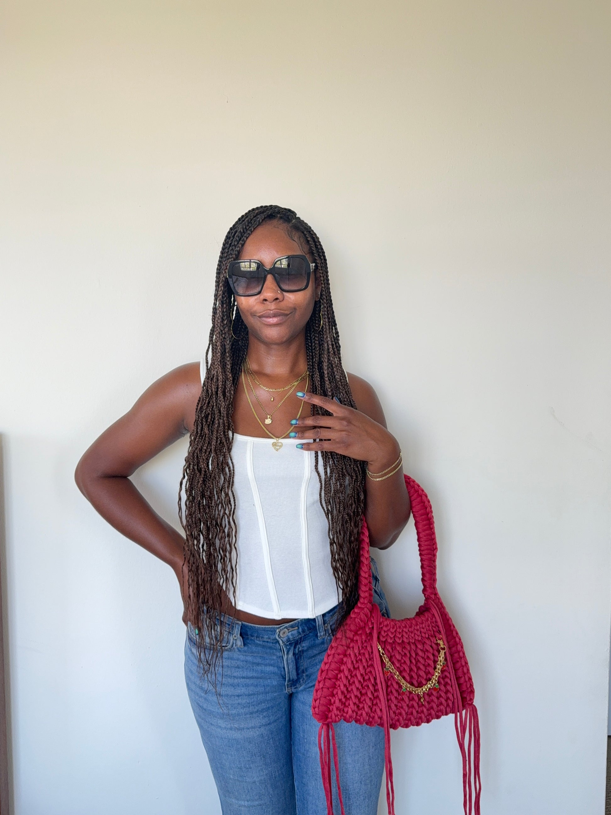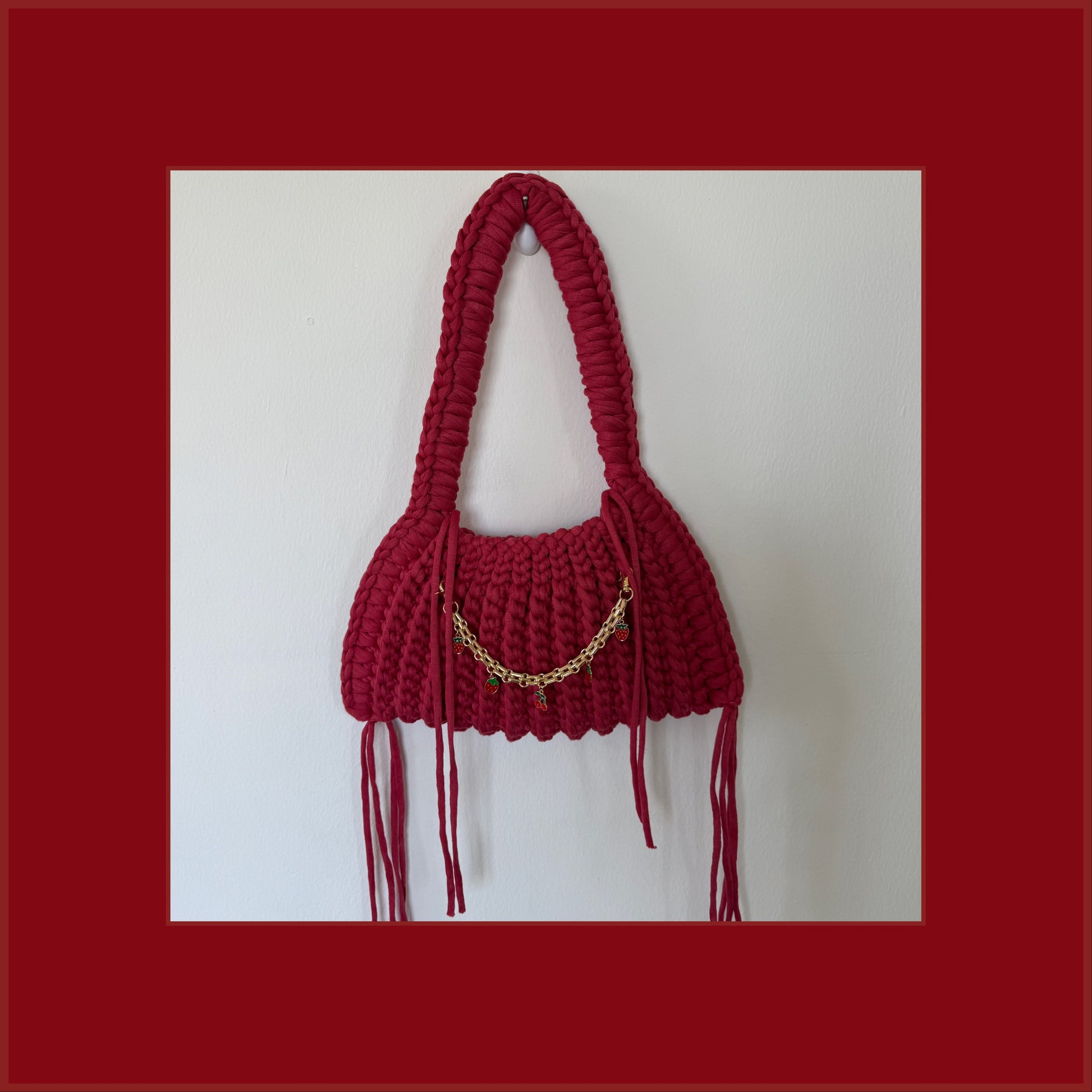 This cute and stylish bag will be the statement piece to any outfit. It is soft, spacious, red and adorned with a chain of strawberry charms. Perfect for any occasion.