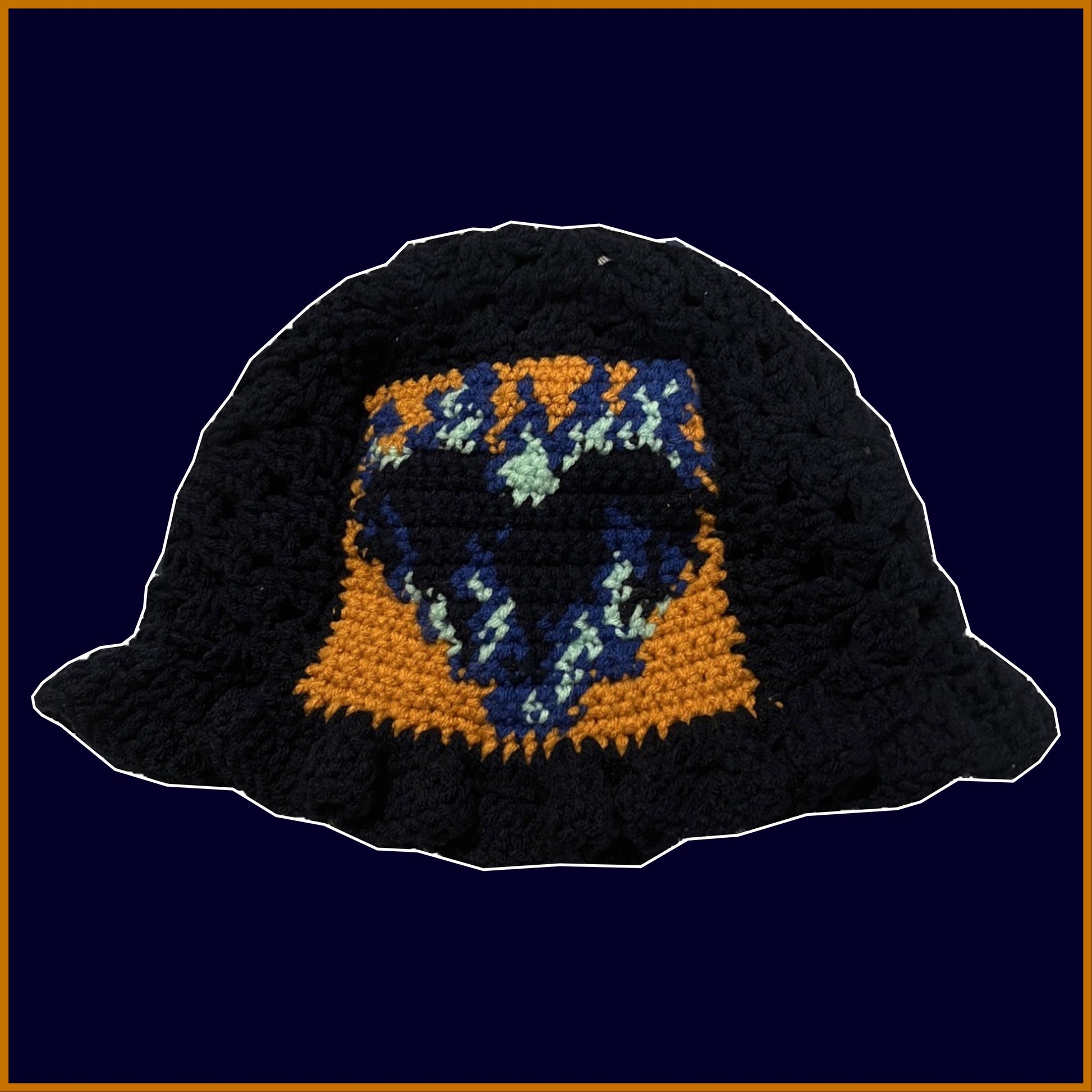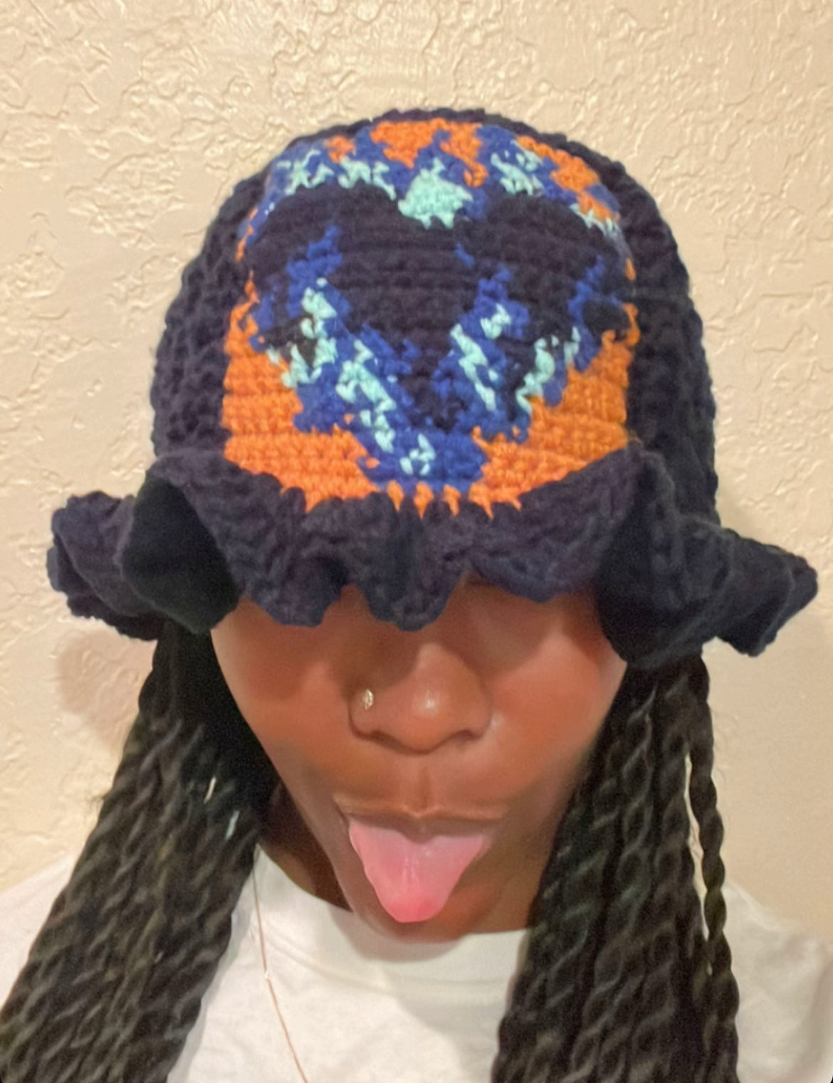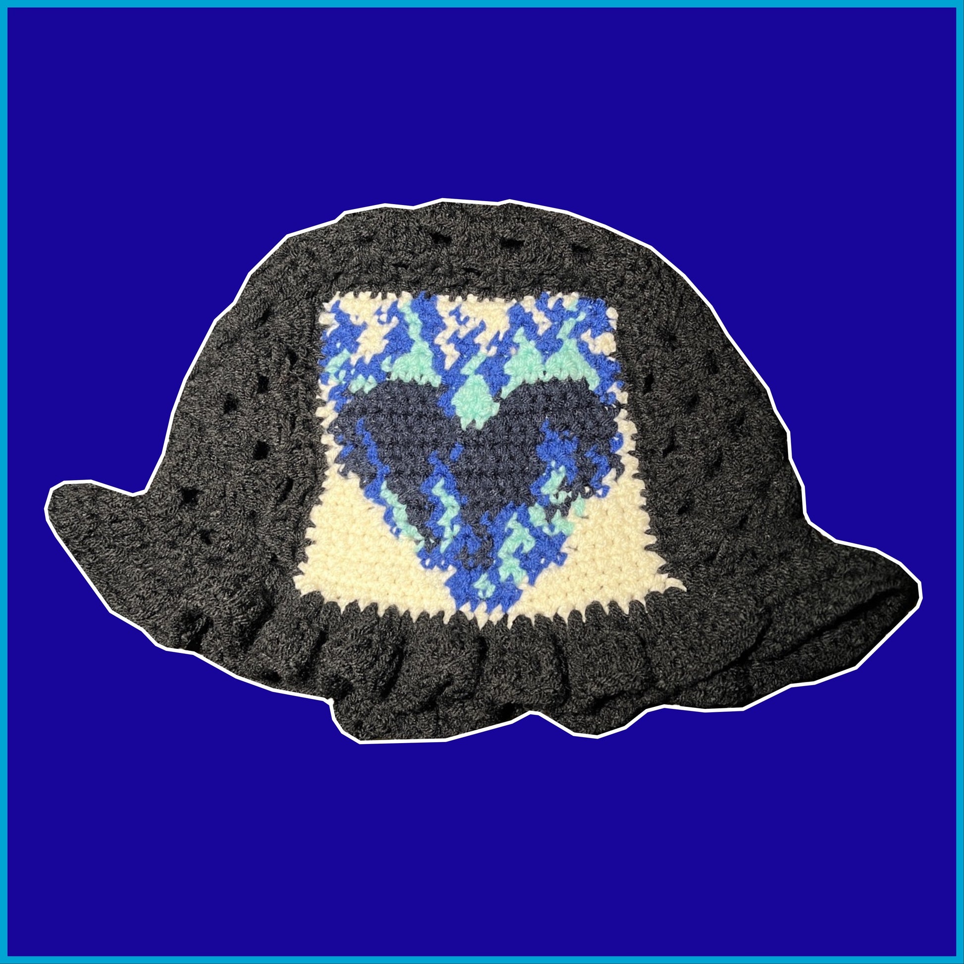 Bucket hat with navy blue, royal blue, and turquoise burning heart design. Ruffle brim.