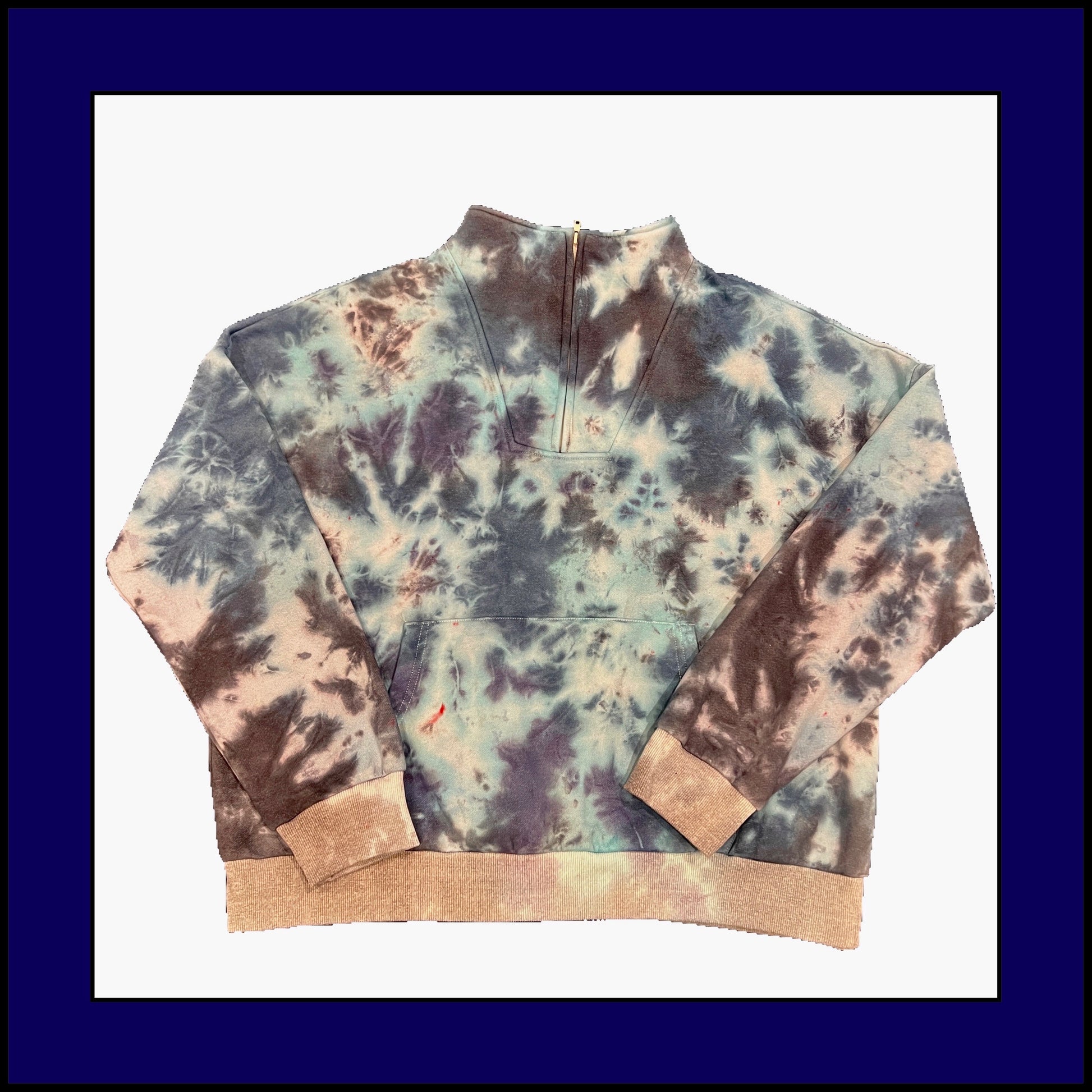 Slightly cropped sweatshirt with zip up collar. Different shades of blue with crumple design