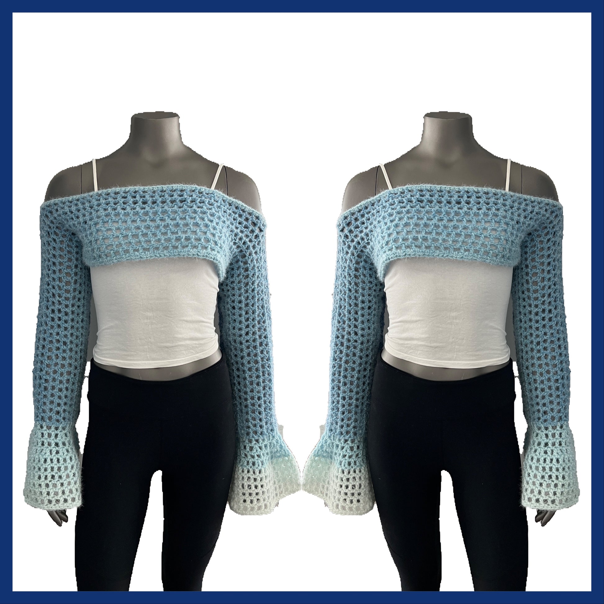 Fuzzy bolero shrug in ombre blue with bell bottom sleeves. Cropped fit and stretches.