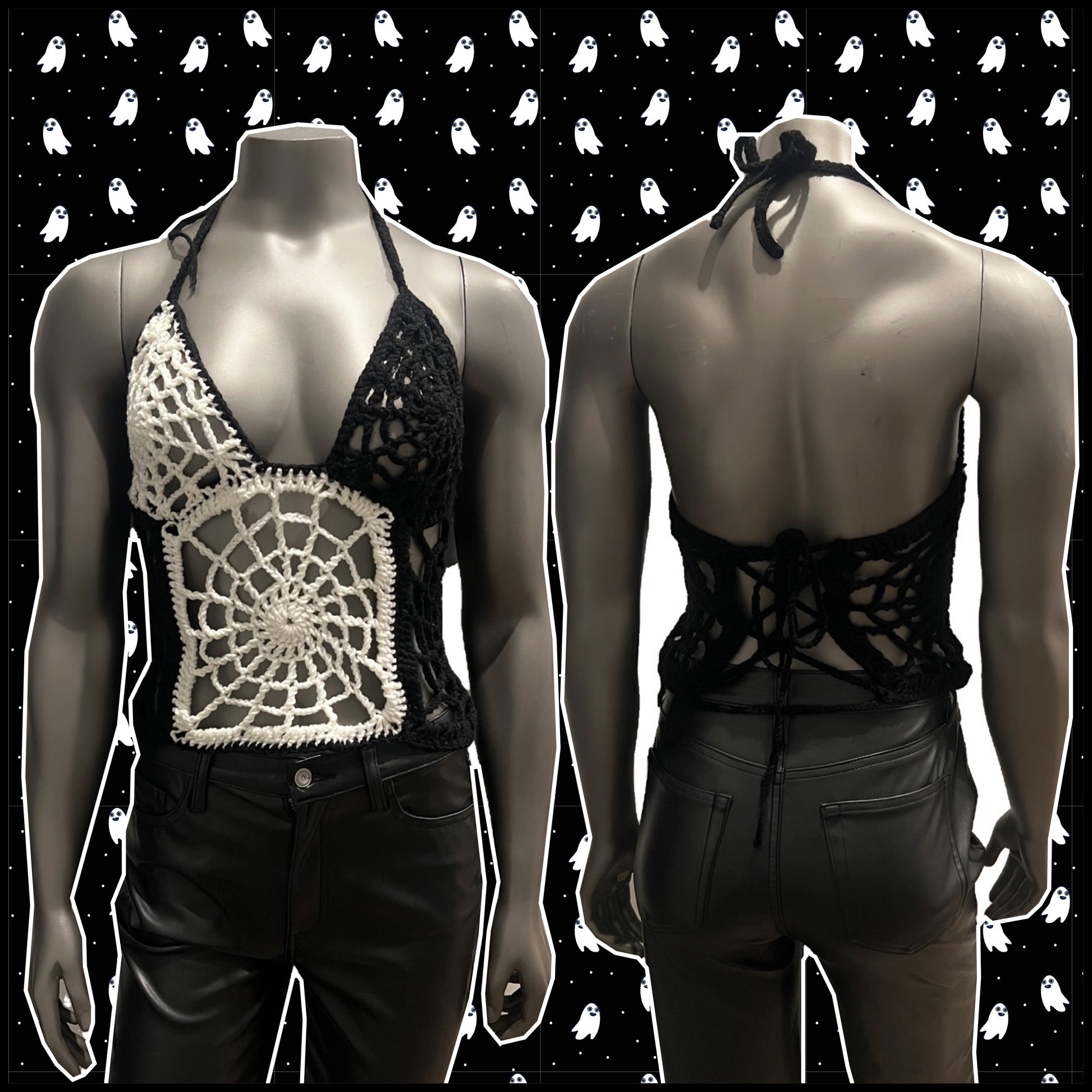 Black and white crocheted spider web halter top. Ties around the neck and the back.